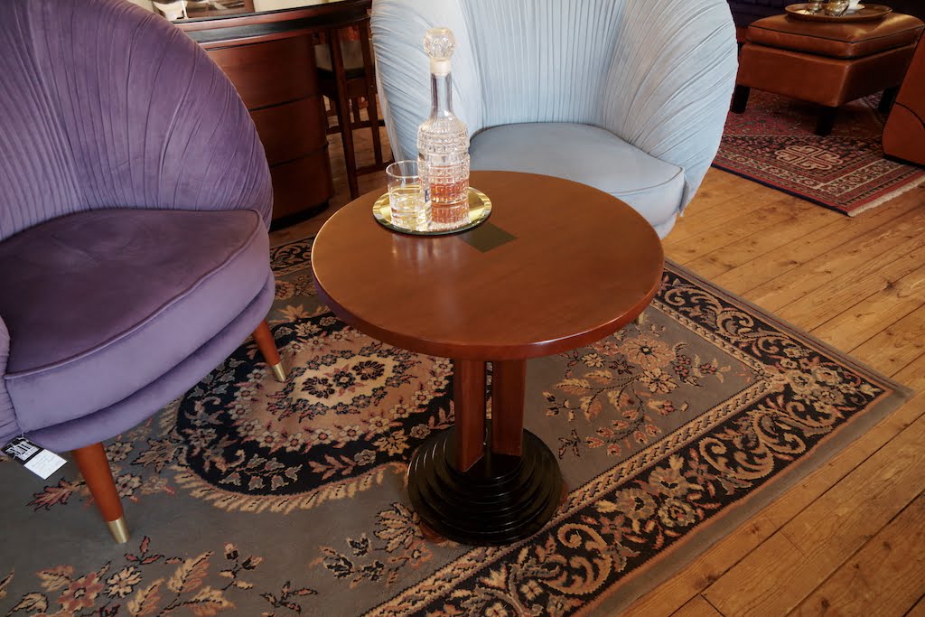 This cute, round side table is a fine example of subtly implemented Art Deco style. At first glance, you see a classic table made of mahogany. But a closer look will catch your eye for its graphic elements. Like the stacked round base and the small, black square as an inlay in the top. A perfect table for next to the sofa, with a plant or a table lamp. The latest models are now very attractively priced.