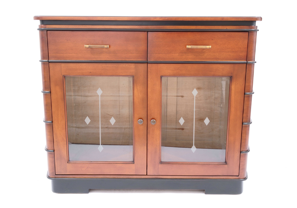 A jewel of an Art Deco display cabinet in Jan Frantzen’s signature Art Deco style. The glass in the doors features a sandblasted Art Deco motif which gives the cabinet a nice touch.This cabinet is made of partially solid mahogany with Art Deco lines and rounded corners.