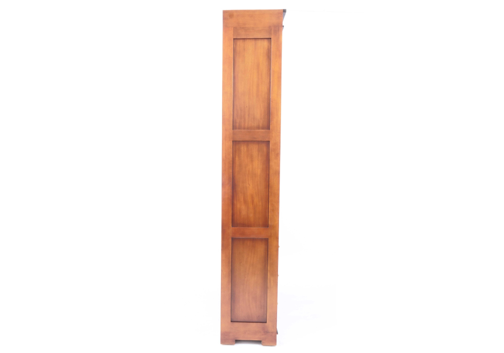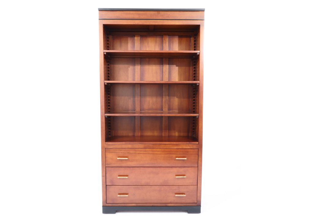 This bookcase provides space for books and decorations, but also has plenty of room to store items out of sight in the 100% pull-out drawers. This cabinet features three adjustable solid shelves. The cabinet is made of solid mahogany in Art-Deco style, as seen in the black details on the doors. The cabinet can be placed on its own or connected. This way you can compose your own personal book wall. This stunning bookcase can also be completely customized.
