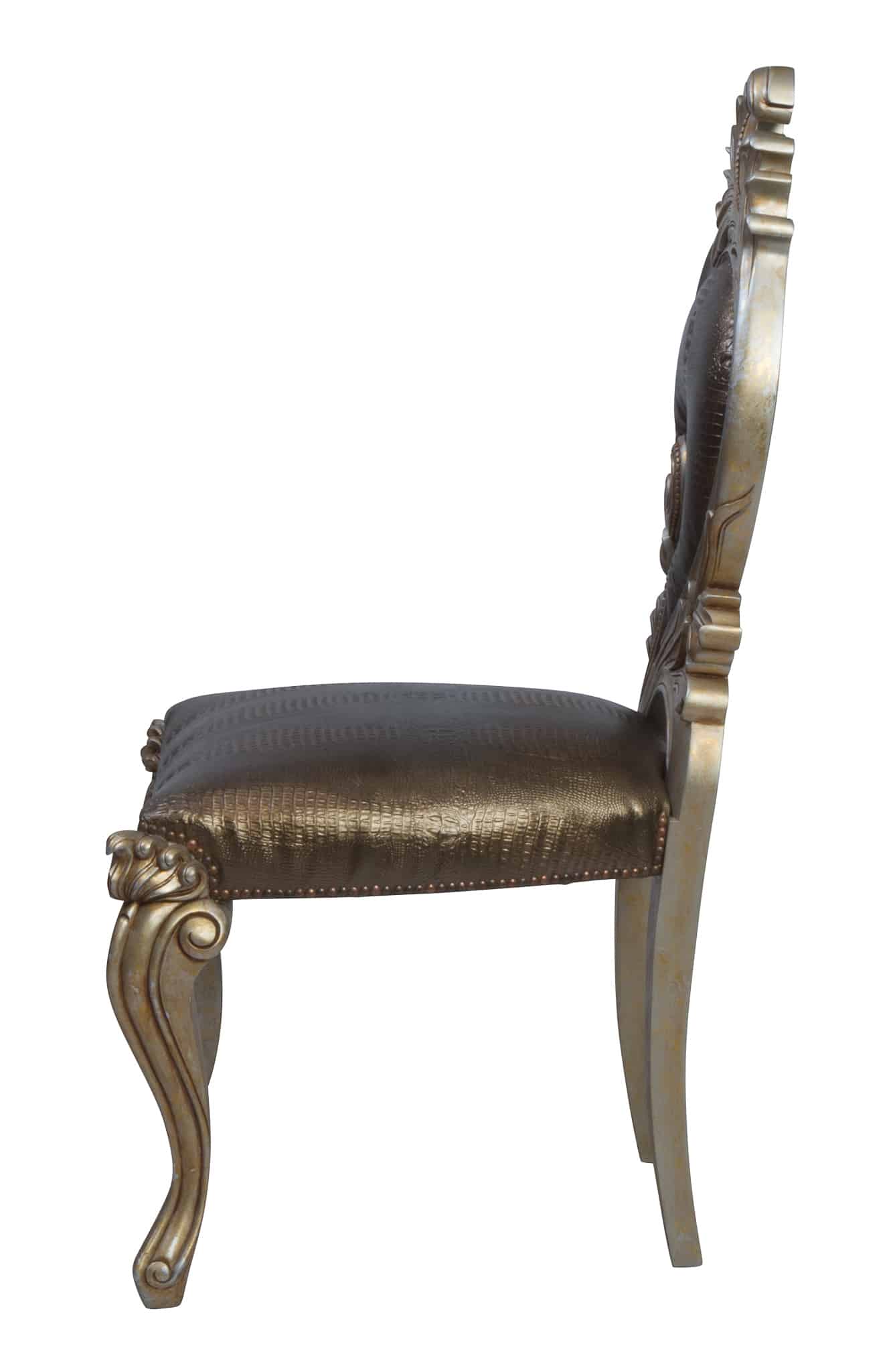 Separate dining chair in mixed furniture styles. Upholstered in a bold crocodile leather look. There are two pieces left in stock. Price per piece!
