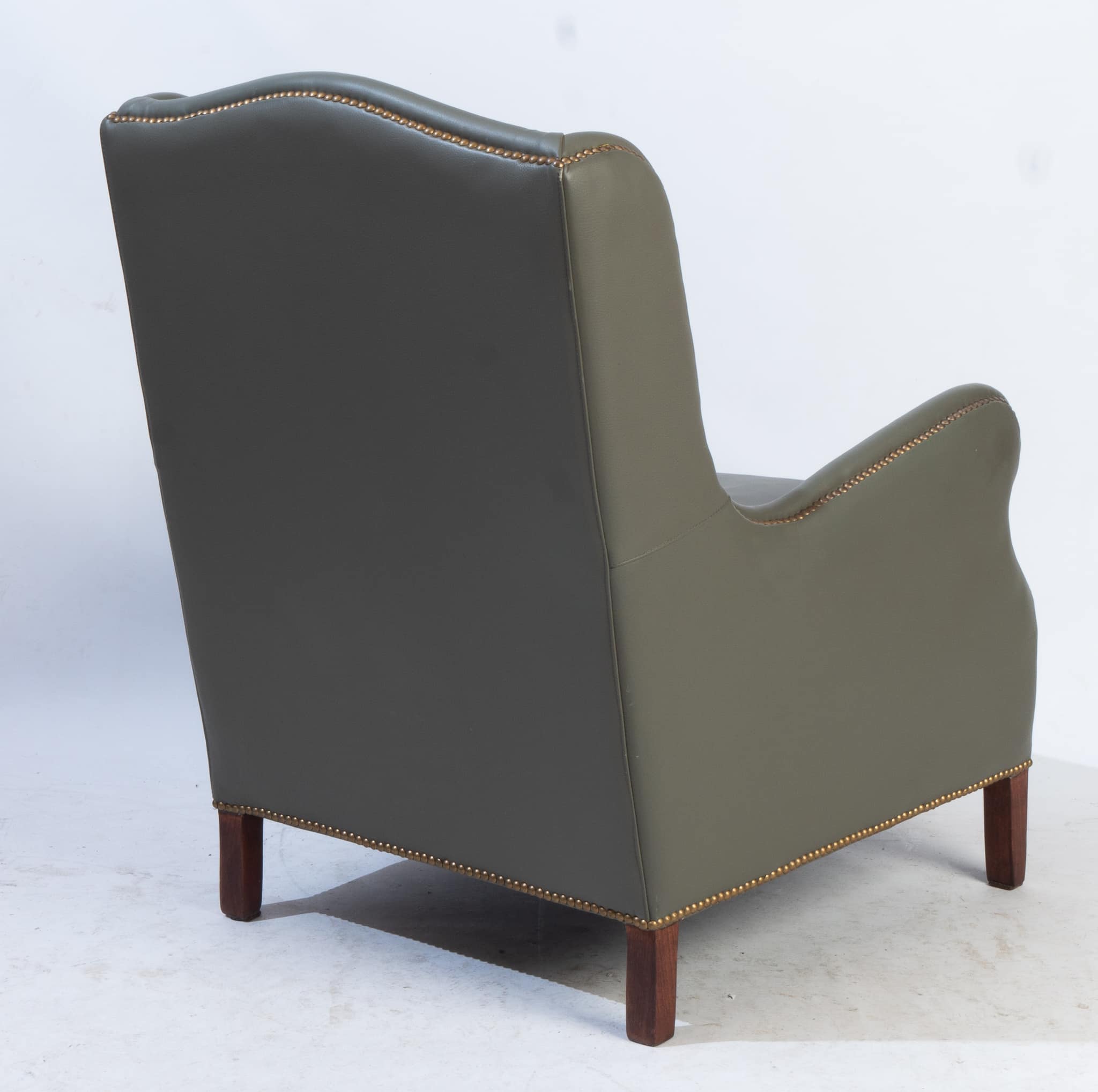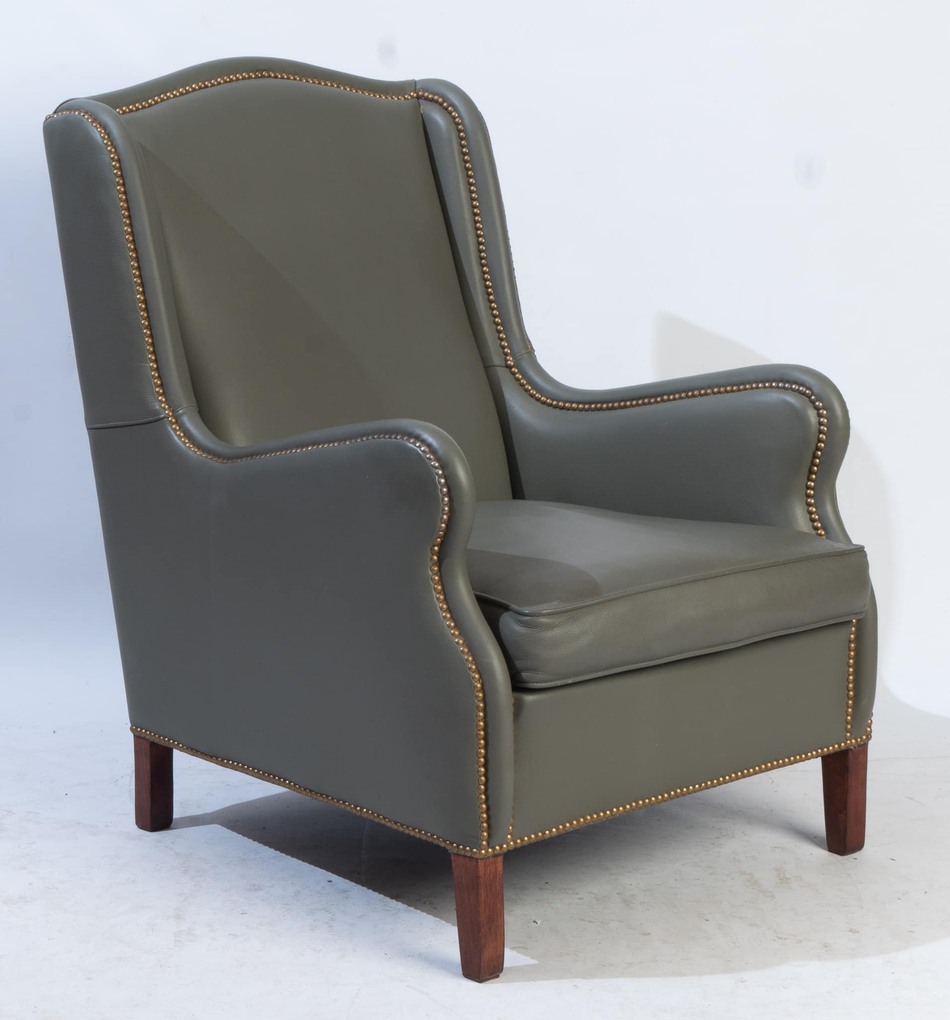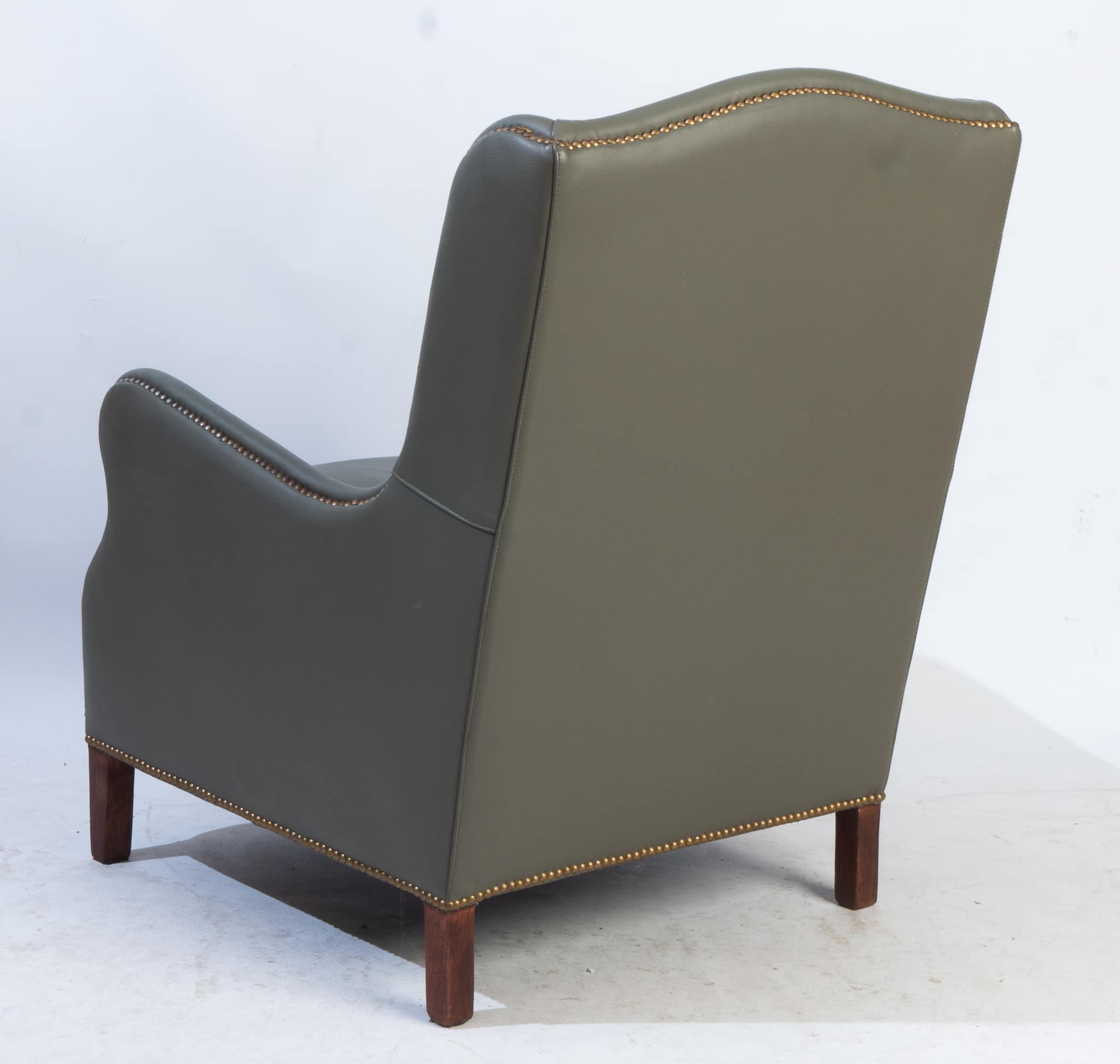Original english ear armchair. Upholstered in a heavy quality cowhide leather. The armchair has some signs of use here and there, but that only adds character. The armchair is trimmed with copper decorative nails.