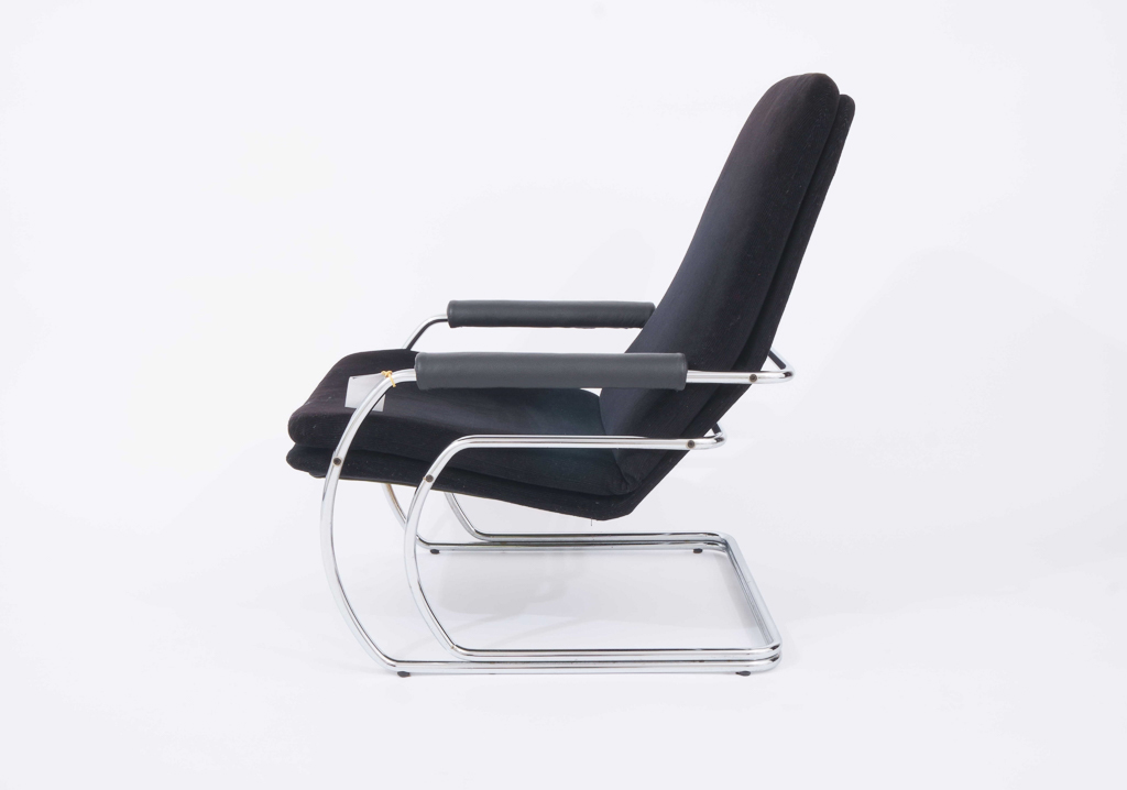 Early model by Jan de Bouvrie commissioned by furniture factory Gelderland. This armchair is constructed with a chromed tubular frame. The seat is upholstered in black corduroy and the armrests in black cowhide leather. The armchair is in nice vintage condition with some signs of use.