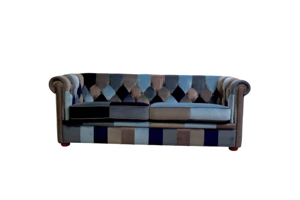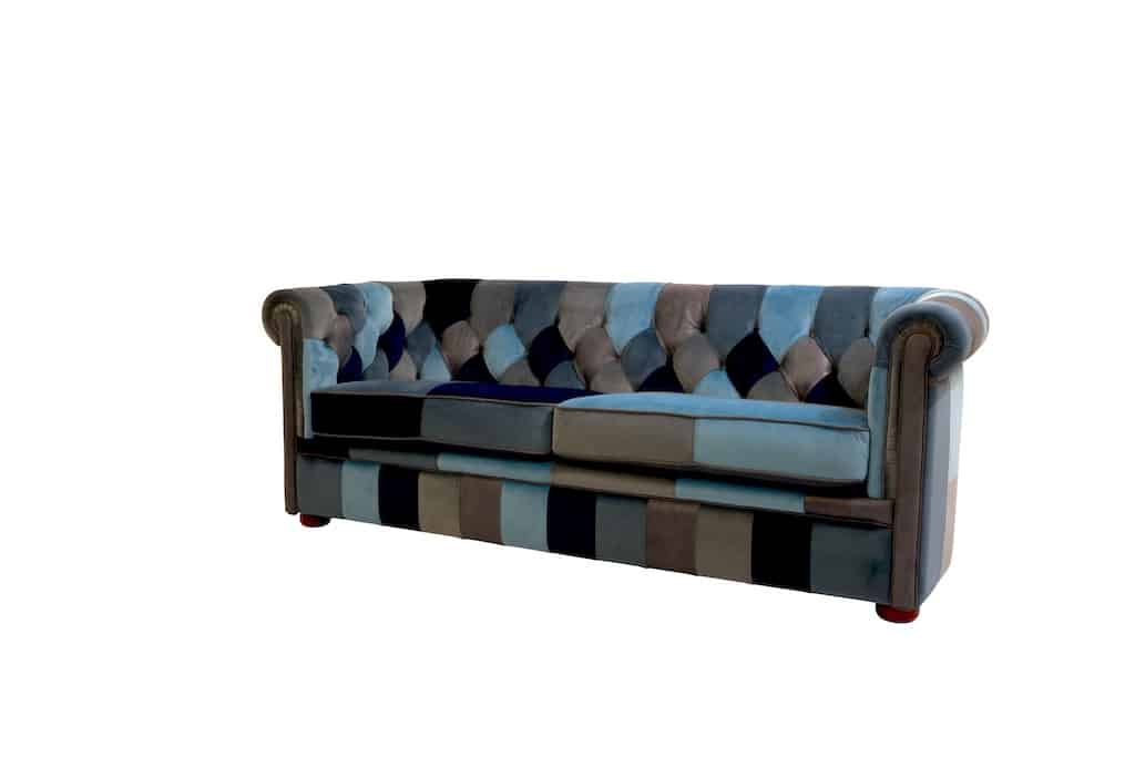 Using different colors of velours you will create your own atmosphere in your home, like this version in blue Patchwork with leather accents. Choice of more than 130 different colors of velvet, and many colors of cowhide leather. Furthermore, this sofa is completely customizable, and customizable to your liking.