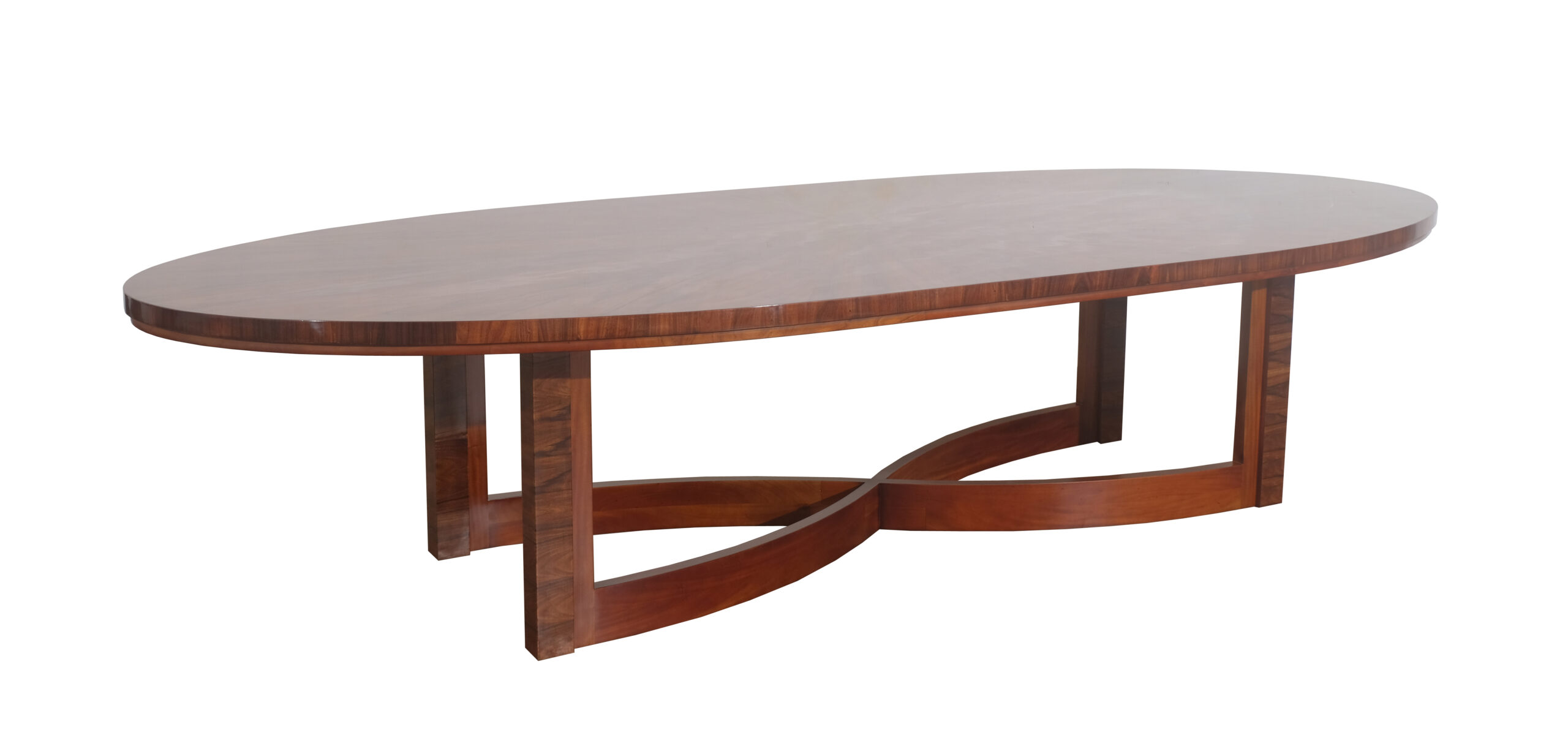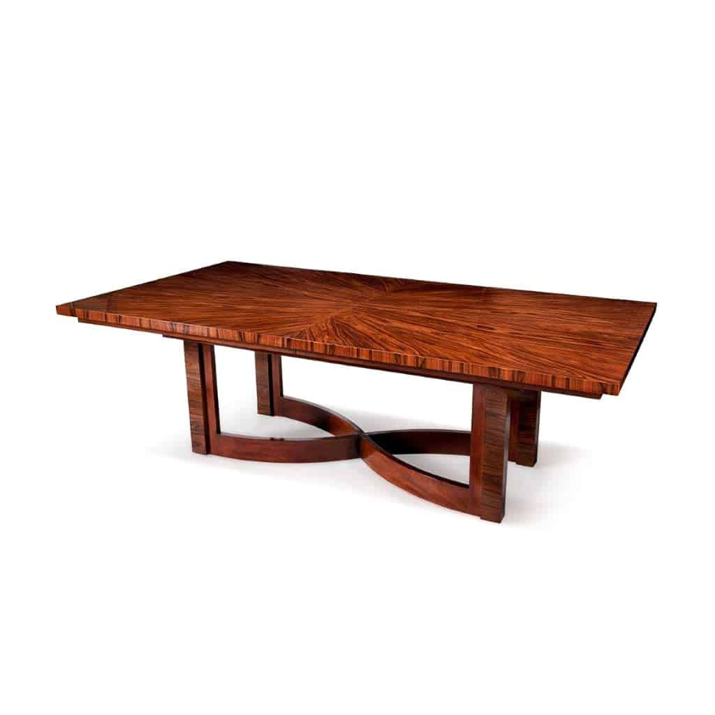 Despite its rectangular top, graceful is the best description for this Art Deco table with a rosewood veneer. A special technique was used for this, where each piece of veneer is the mirror image of the adjacent piece. In addition, the leg has an hourglass shape with graceful lines. Through special rails you enlarge the table in a smooth movement. The top has a very hard top layer due to the finish with a two-component varnish. This table can also be ordered made to measure and in other types of wood.