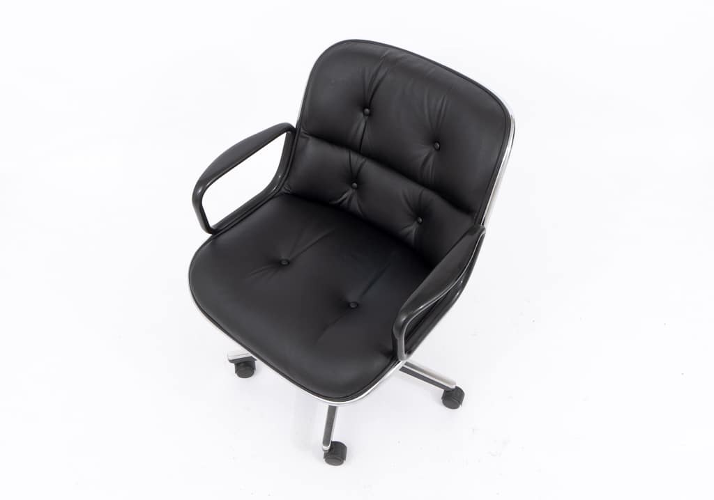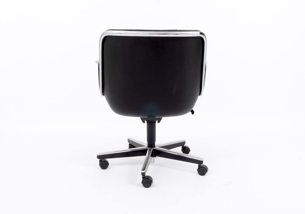 An elegant design classic, the Pollock Executive Chair is an eye-catcher in any modern workspace or conference room. A striking element in the timeless design is the aluminum band around the perimeter of the chair. The upholstered seat is very comfortable and the armrests also contribute to an ergonomic sitting position. The Pollock Executive Armchair came with a practical five-legged steel base, durably finished with black protective epoxy finish. The upholstery is high quality black Volo leather.